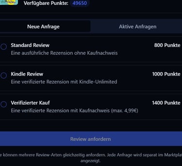 Autoren fordern eine Rezension an und wählen die Art (z. B. Standard, Kindle). Passende Rezensenten lesen das Buch, verfassen eine Rezension und veröffentlichen diese auf Amazon. Die Echtheit wird über unsere Plattform verifiziert.